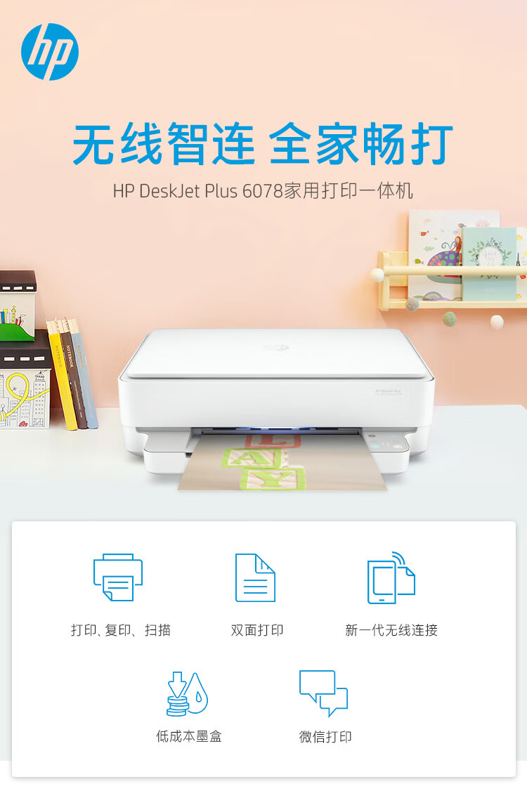 惠普(HP)DJ6078无线家用打印机打印扫描复印多功能打印机学生家用照片打印微信打印