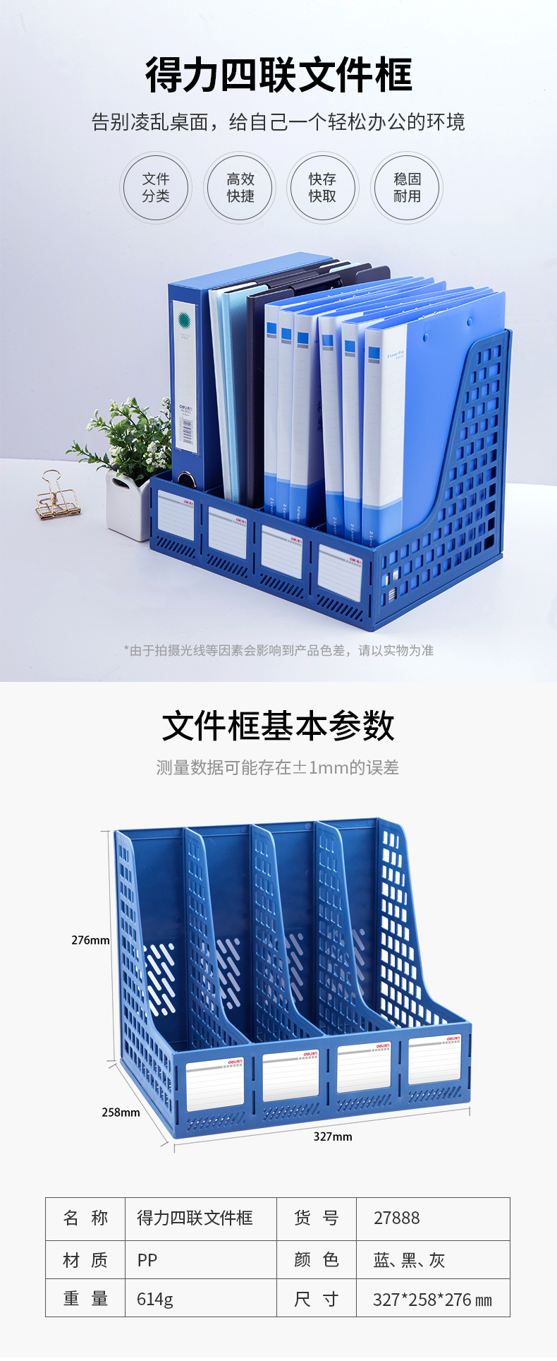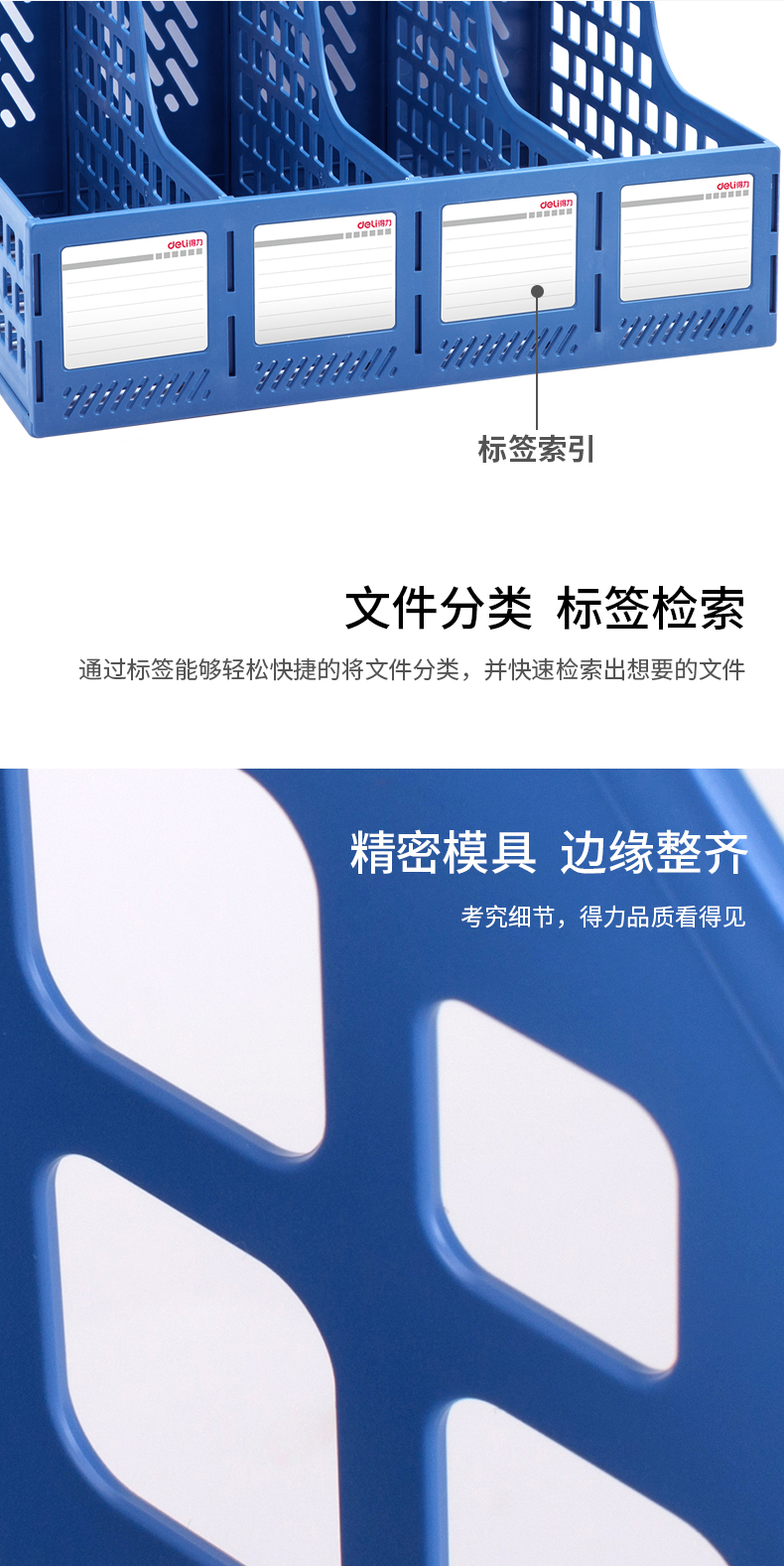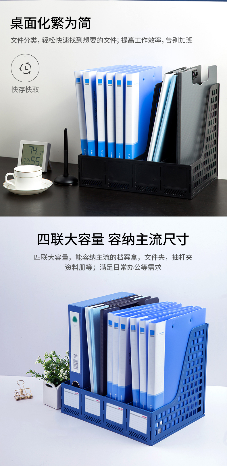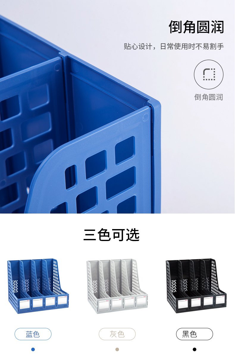 文具得力(deli)4联镂空桌面文件框书立办公室桌面四栏带标签资料文件架书本资料收纳神器蓝色27888